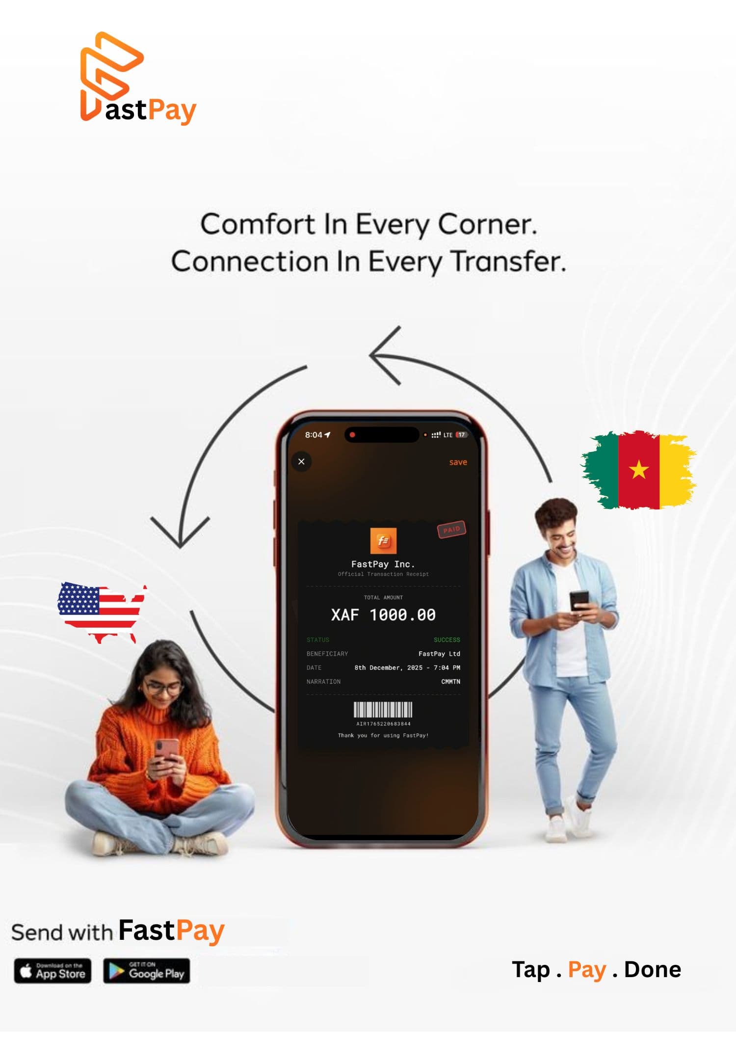 FastPay Cameroon Limited is a registered legal entity in Cameroon. FastPay is not a bank, all banking services are offered in partnership with licensed partners in Cameroon.
